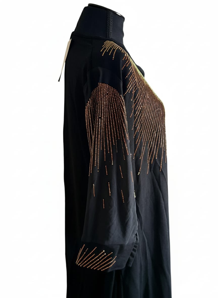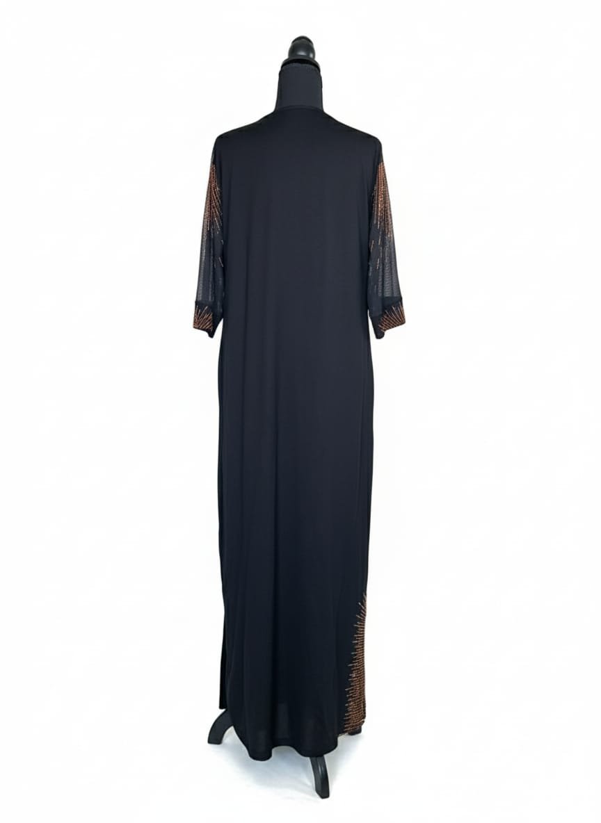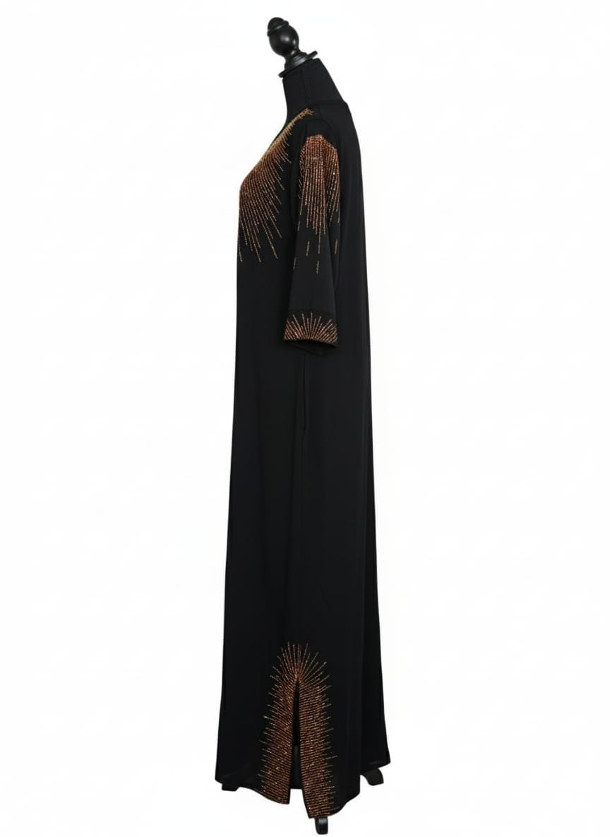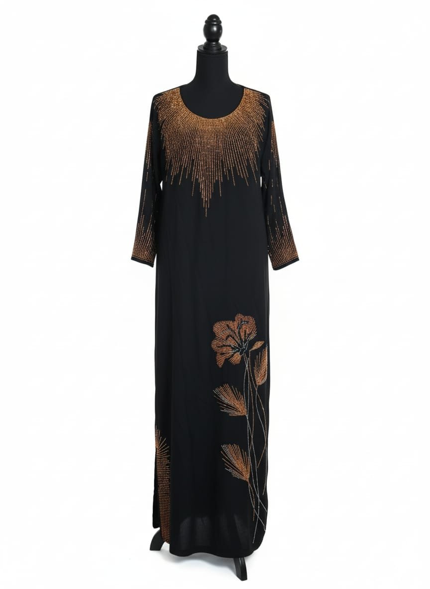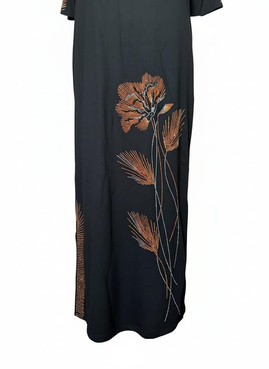 Elegant, easy, and a little bit glamorous—this black maxi dress makes getting dressed feel special. Rows of bronze crystals radiate from the neckline and trail down the sleeves, while a floral motif at the skirt adds a soft, feminine touch. The column silhouette skims the body without clinging, and subtle side slits give you room to move.