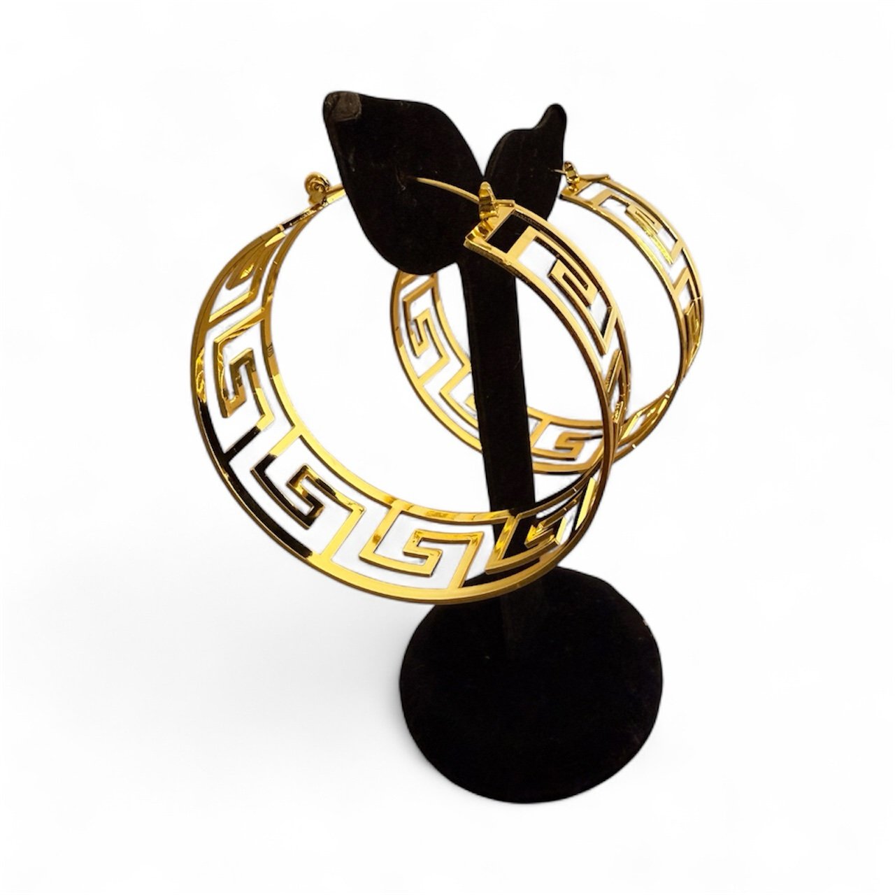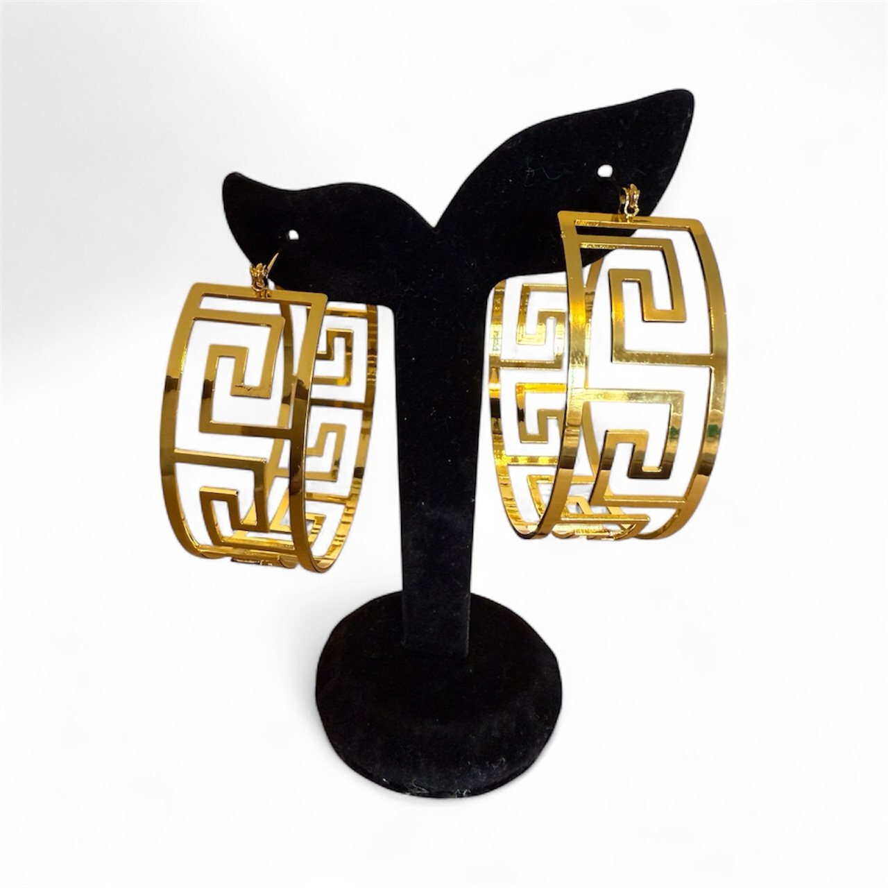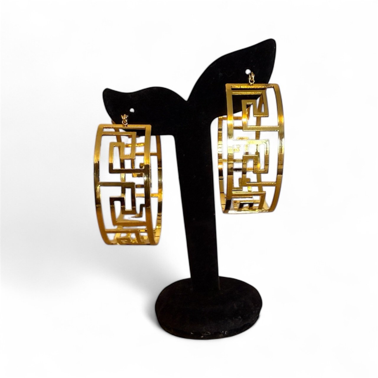 Radiate elegance with these bold gold-tone statement hoops. Their intricate geometric design and mirror-like shine give a luxe, designer feel perfect for adding a touch of sophistication and confidence to any outfit.