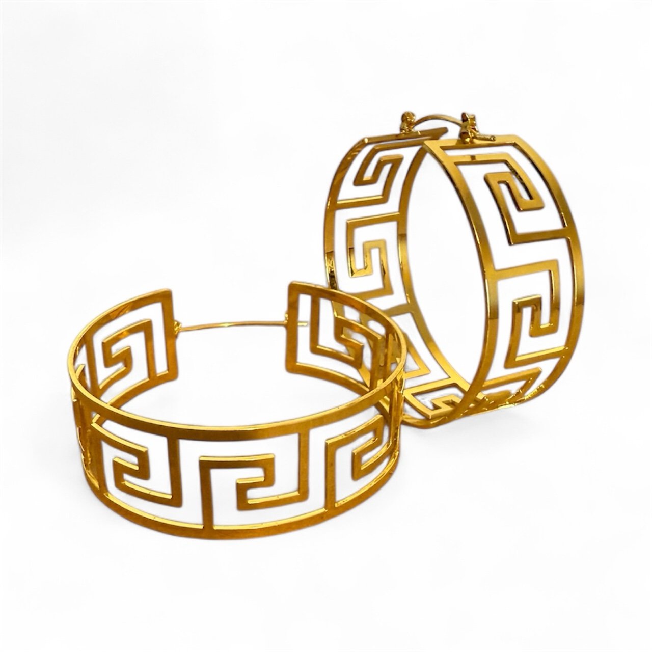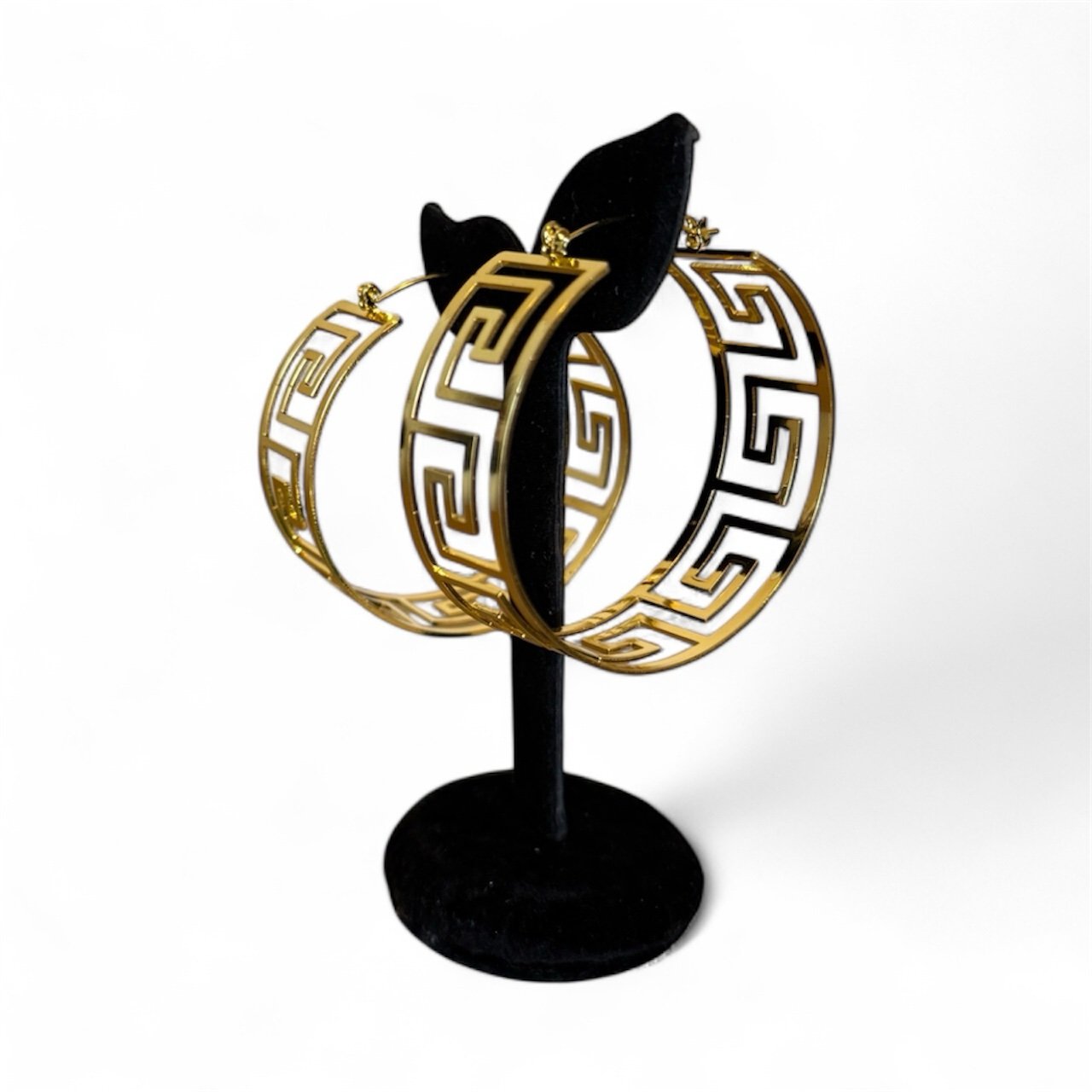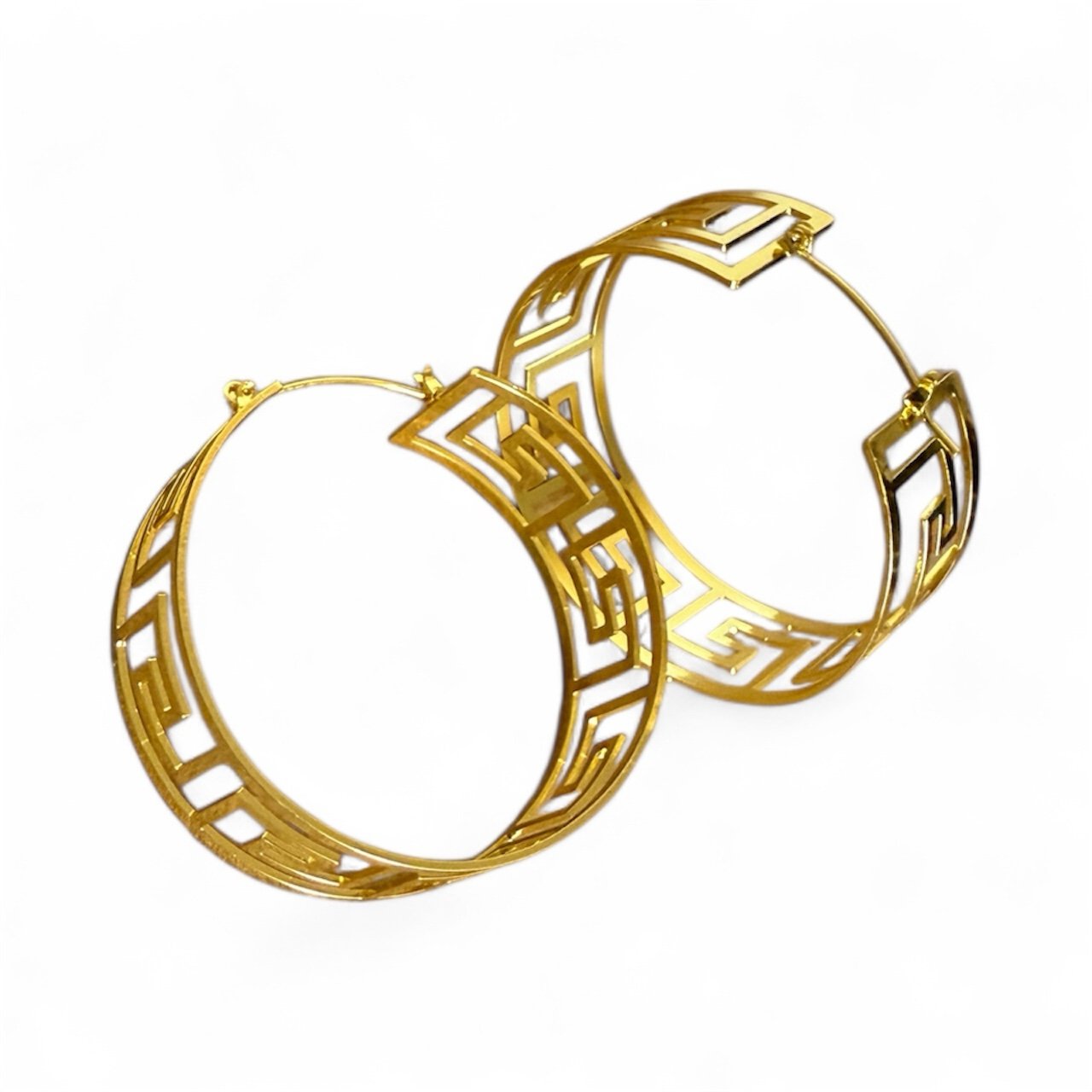 Radiate elegance with these bold gold-tone statement hoops. Their intricate geometric design and mirror-like shine give a luxe, designer feel perfect for adding a touch of sophistication and confidence to any outfit.