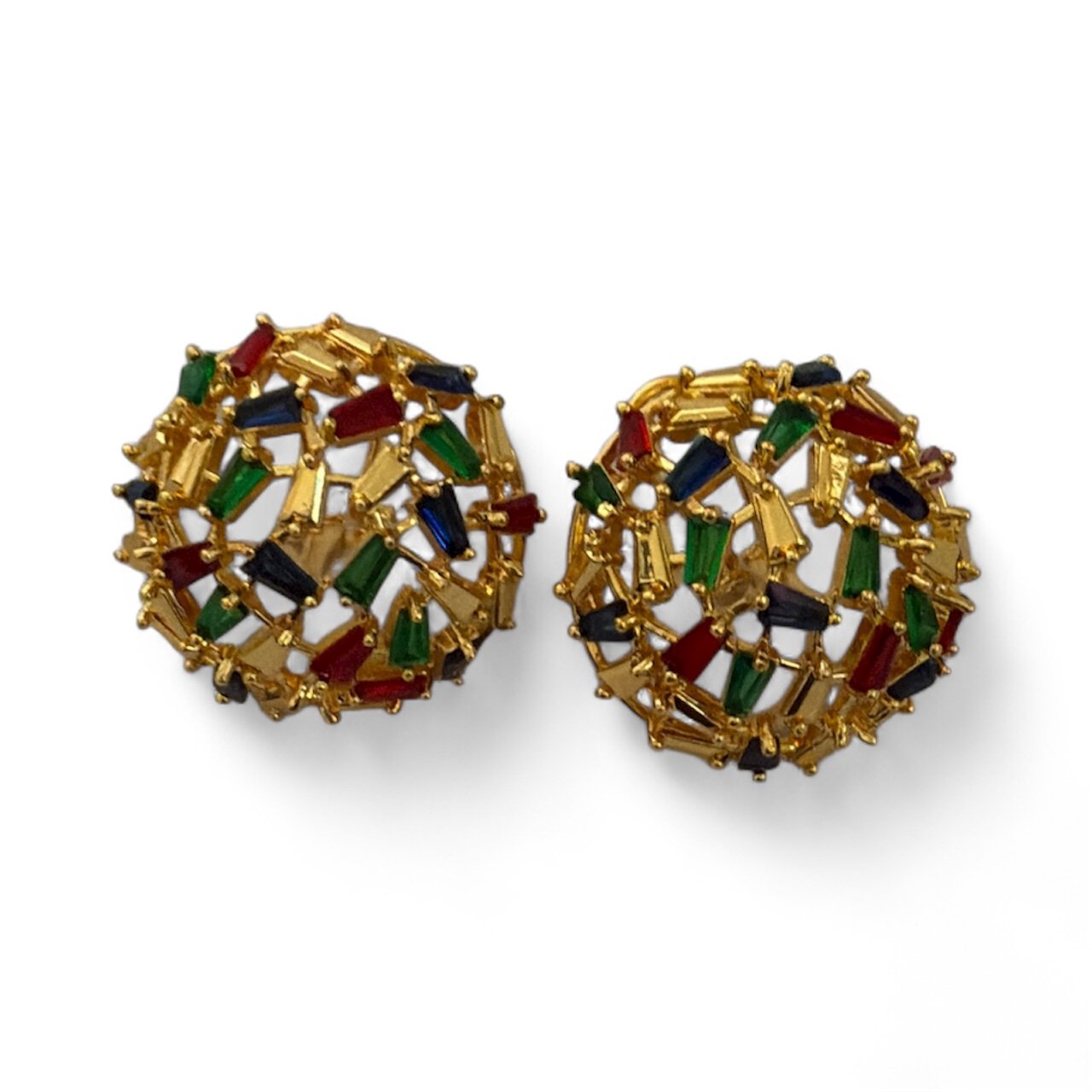Cheery, domed studs covered in multicolor baguette crystals set on a warm gold-tone lattice. Light, about 1” across—an easy pop of color that instantly brightens any outfit.