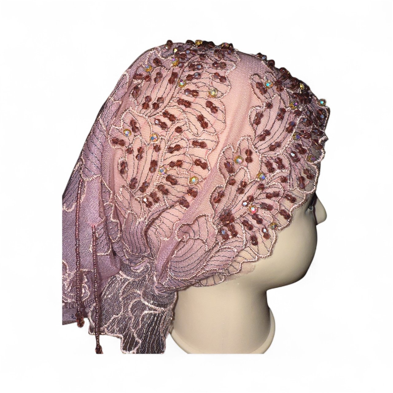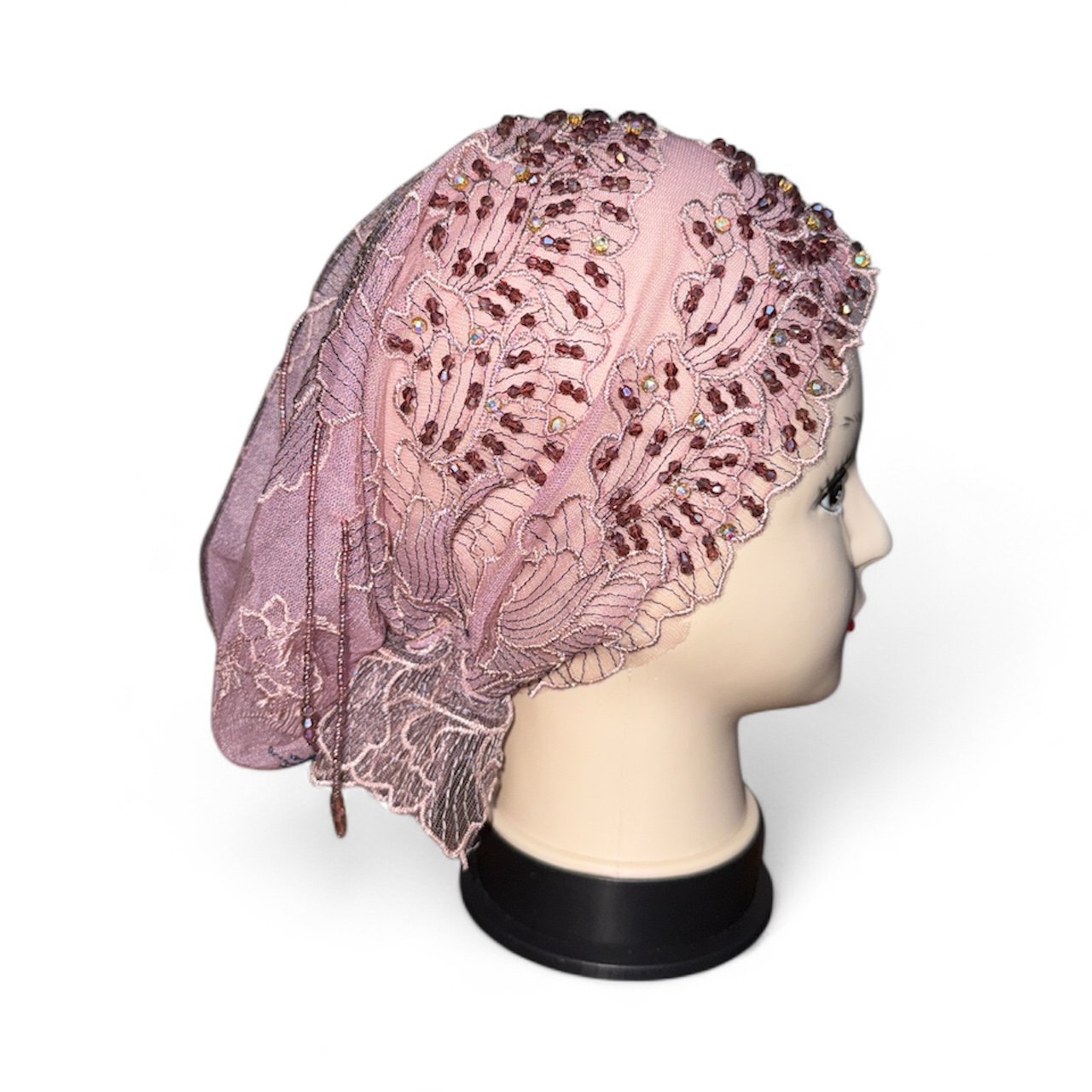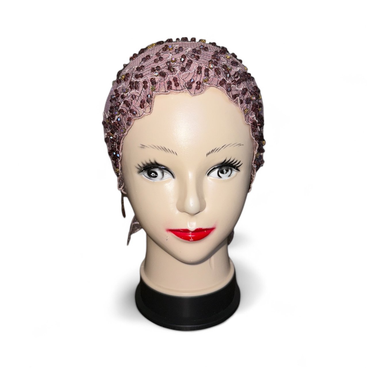 Meet the show-stopper you throw on in seconds. This ready-to-wear turban is crafted from soft, lightweight lace in a romantic dusty-rose tone and finished with hand-placed crystals and floral appliqués that catch the light beautifully. It’s elegant without trying too hard—perfect for weddings, Eid, parties, or whenever you want your headwrap to do the talking.