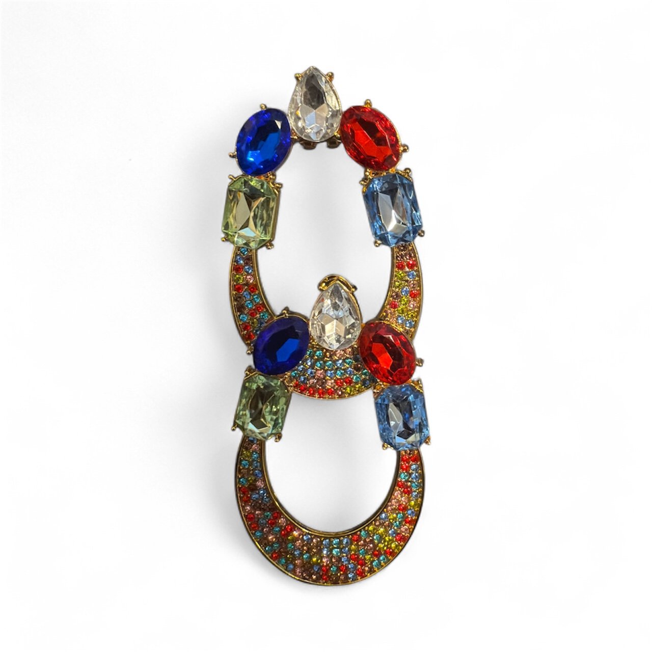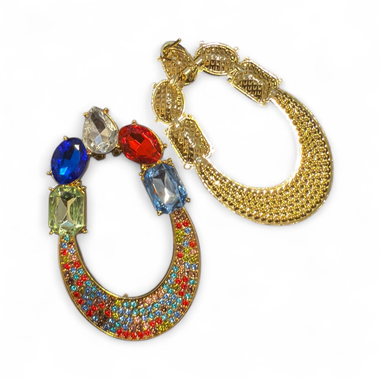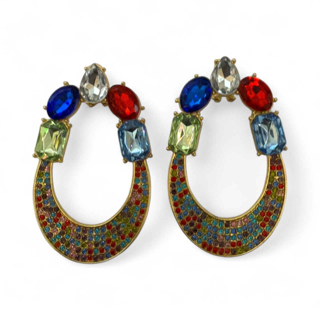Turn every outfit into a moment. These statement earrings pair a vintage-inspired crescent hoop with a playful mix of jewel-tone crystals—think sapphire, ruby, peridot and aquamarine—plus a sparkle-rich pavé along the curve. Set in warm gold-tone metal, they catch the light beautifully without feeling over the top.
