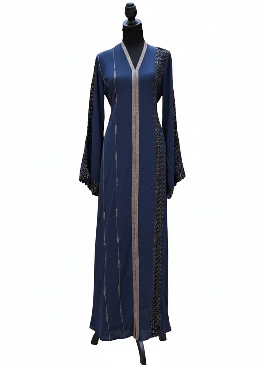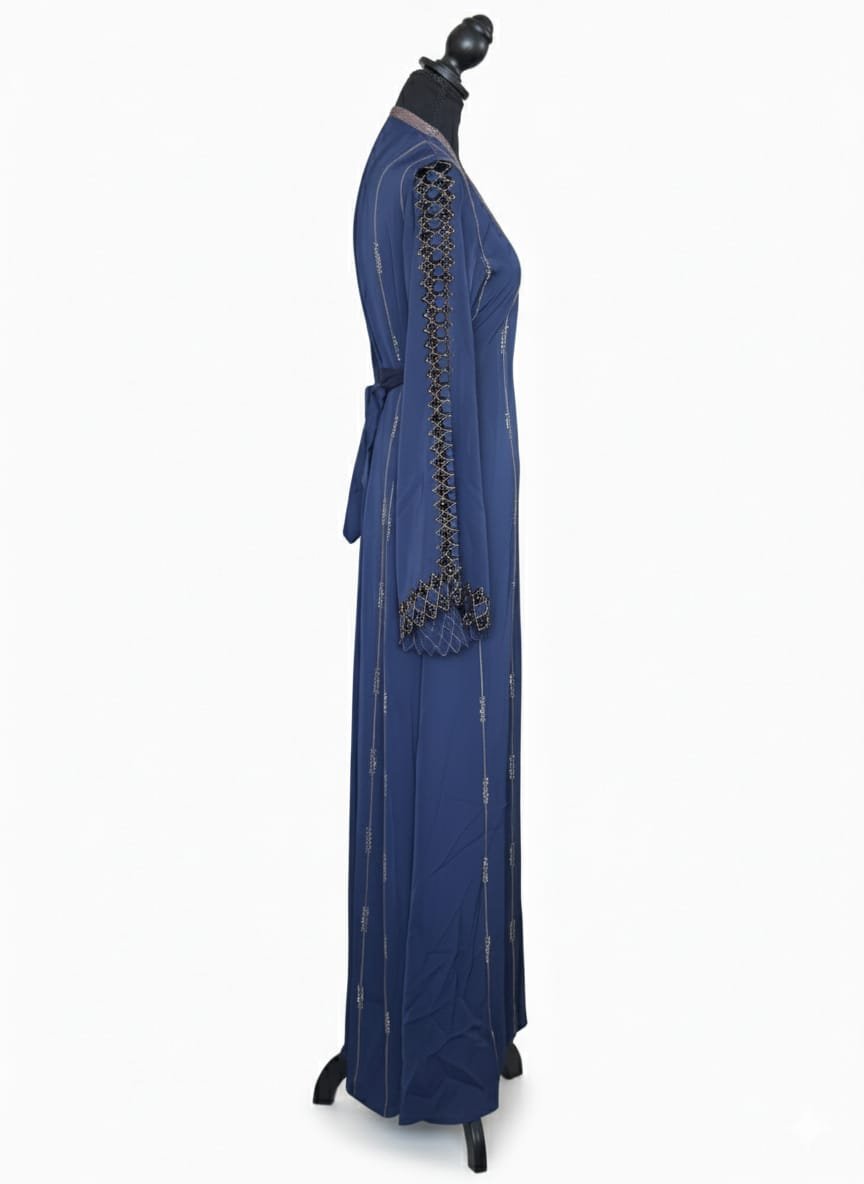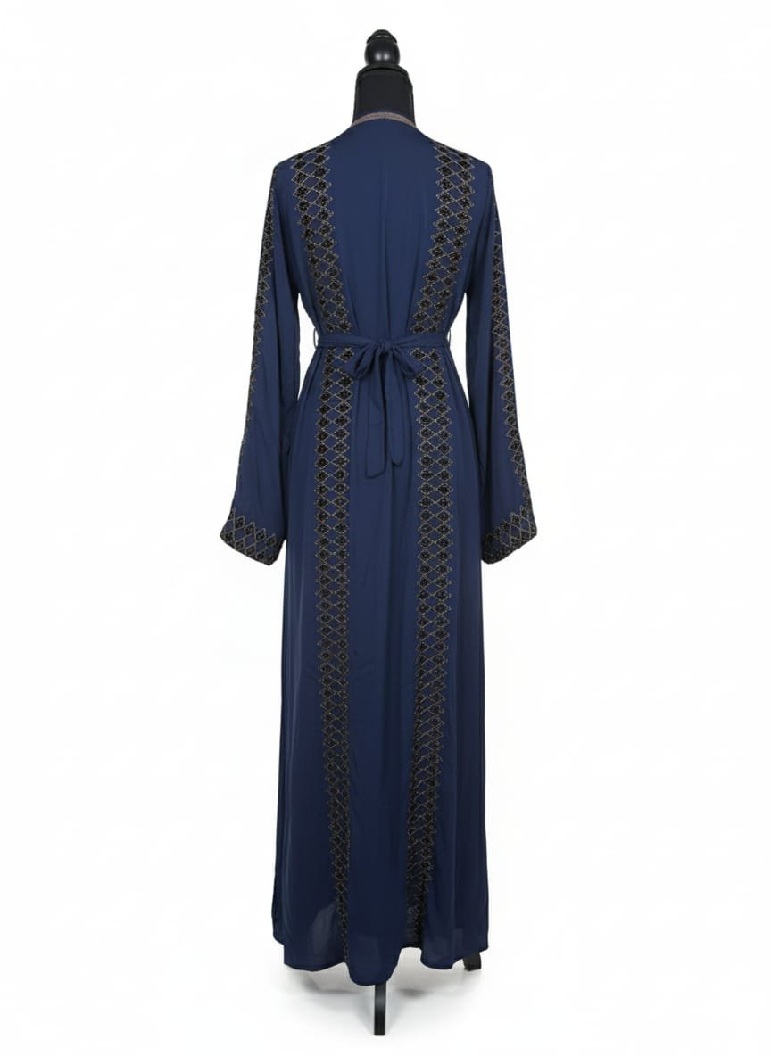 Graceful, modest and effortlessly elegant—this abaya brings instant polish to your look. Crafted in a deep midnight-navy crepe with beautiful movement, it’s finished with intricate metallic embroidery that runs along the front panel, sleeves and back for a quietly luxe shimmer. A self-tie belt lets you define the waist (or wear it loose for a floaty silhouette), and the set includes a matching scarf for a complete, put-together finish.