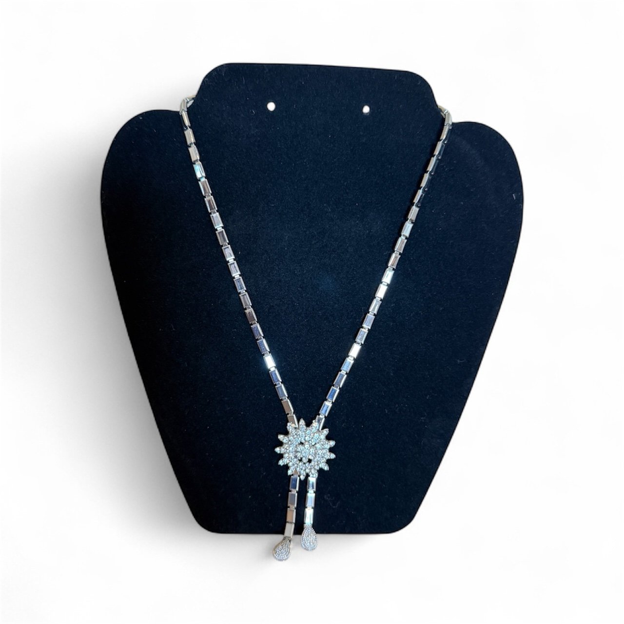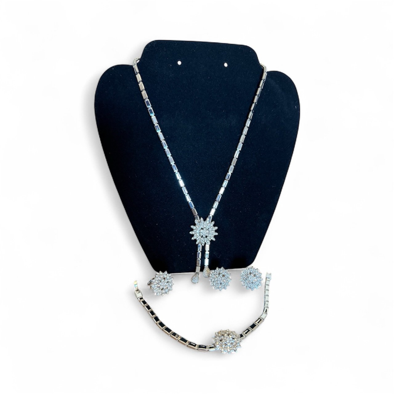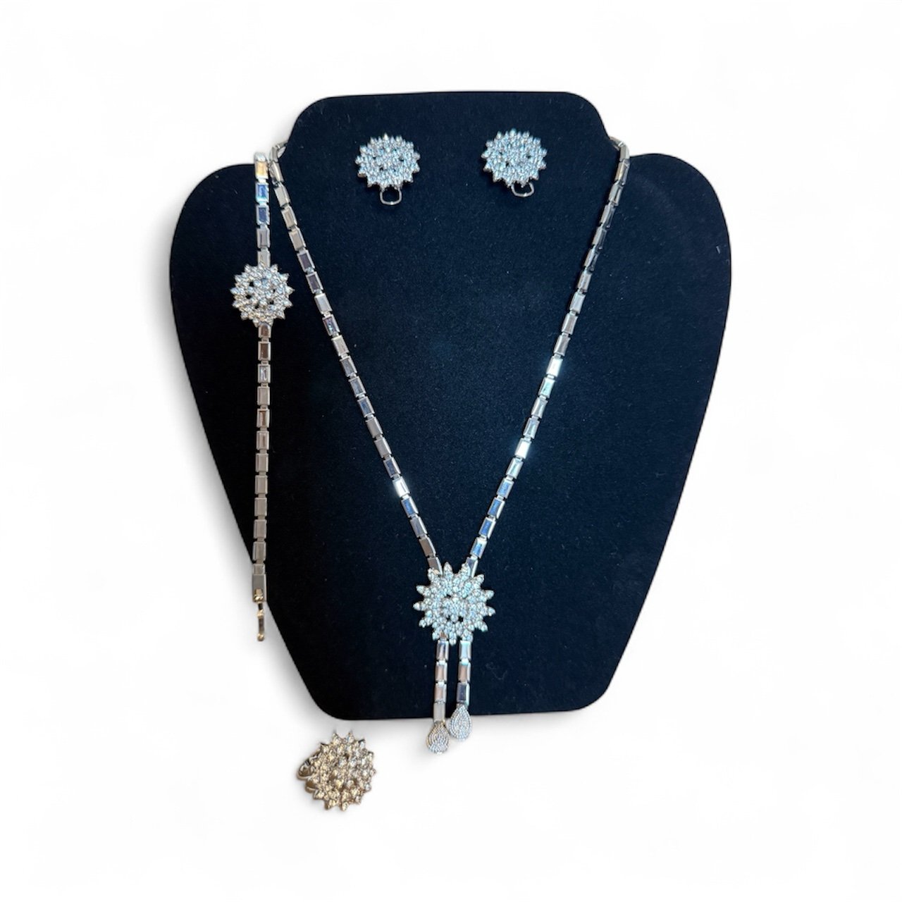 Indulge in timeless sophistication with this stunning silver crystal jewelry set, a masterpiece designed to capture light and admiration from every angle. The intricately crafted necklace, bracelet, earrings, and ring feature a radiant floral motif adorned with glistening stones that shimmer with effortless grace. Perfect for weddings, evening events, or any occasion that calls for refined glamour, this set exudes luxury, confidence, and poise. It’s not just jewelry, it’s a statement of elegance.